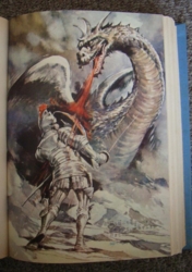 1960年代に小学館がカラー版名作全集「少年少女 世界の文学 1〜30巻」を出していた。そのうち2冊を親が買い、小学生の時に繰り返し読んだ。一つは日本のもので、宮沢賢治「風の又三郎」に黒岩涙香「死美人」があり、イギリス編にはスティーブンソン「宝島」と「不思議の国のアリス」、「ベオウルフ」が載っていた。それぞれに写実的で美しい挿絵がのっていて、小説のタイトルと一緒にその絵を思い出すことができる。「ベオウルフ」では見開きでグレンデルの手を後ろ手に絡める甲冑姿のベオウルフ、竜の炎にあおられる老いたベオウルフなどが印象的。(古本屋で入手したので、挿絵を公開しよう。)